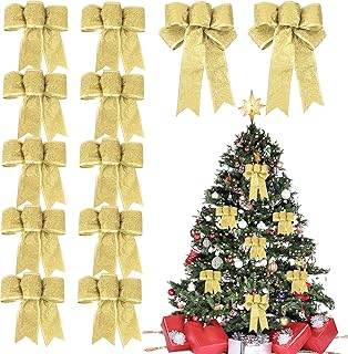 BETESSIN 12 Stücke Weihnachtsschleifen Gold Weihnachten Schleifen Deko Weihnachtsbaum Schleifen Glitzer Weihnachtsbaumschmuck Weihnachtsdeko Weihnachtskranzdeko Homedeko