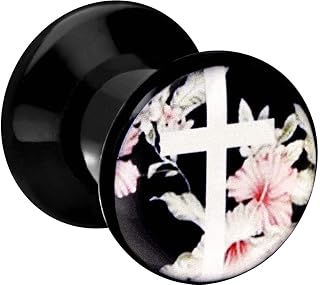 Acryl Plug schwarz | Kreuz BLÜTEN Motiv | Piercing Ohr Tunnel | Größenauswahl
